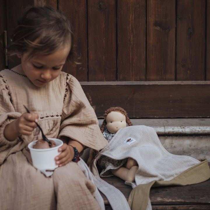 Le porte-poupée combine le design élégant de Mama Nuka avec un tissu écharpe de haute qualité tissé à la main et teint purement végétal. Il se glisse dans n'importe quel sac à main et constitue un excellent compagnon de voyage.
